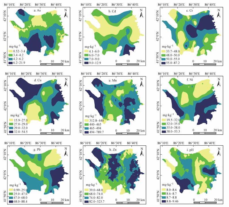 图 2可知, 研究区耕地土壤中8种重金属元素空间分布格局各不相同, 基本呈现岛状分布格局.各重金属元素均出现含量高值区, 表明该区域人类活动对耕地土壤中重金属含量具有负面效应. As含量较高的区域主要分布于研究区南部与西北部, Cd含量较高的区域主要分布于研究区东南部, Cr含量较高的区域主要分布于研究区中部和东北部, Cu含量较高的区域主要分布于研究区的东部和西北部, Mn含量较高的区域主要分布于研究区西部和东南部;Ni和Pb含量空间分布格局比较相似, 含量较高的区域主要分布于研究区东南部和西南部, Zn在研究区东部, 中部和西北部出现高值区.土壤pH值含量较高的区域主要分布于研究区东部和西南部.结合野外考察采样点实际情况发现, 重金属含量较高的区域主要分布于查干诺尔乡、塔温觉肯乡、七个星镇、包尔海乡、才坎诺尔、乌兰再格森乡、永宁镇以及焉耆县、博湖县靠近城镇居民点、交通干道附近的耕地.该区域城镇生活, 工、农业生产污染排放以及交通运输含重金属污染物排放很可能是造成研究区耕地土壤重金属污染的主要人为原因.