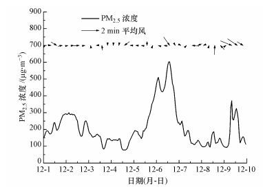 | 图 8 2013年12月1—9日上海地区PM2.5浓度变化时序图(箭头为上海徐家汇观测站整点2 min风矢量) Fig. 8 Time series of PM2.5 concentration in Shanghai during 1—9 December 2013 (Arrow is 2 min wind per hour from Xujiahui station in Shanghai) |