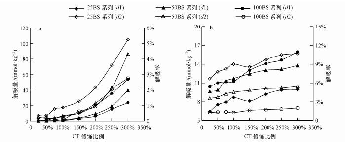 图 1b显示, BS-12解吸的量随着CTMAB修饰比例的增加而略有升高, 当CTMAB的复配比例为300%时, BS-12解吸量达到最高.与CT解吸量相比, BS-12解吸量变化值不大, 25BS系列中BS最高解吸量9.98 mmol·kg-1为最低解吸量6.46 mmol·kg-1的1.53倍, 50BS系列解吸量最高值为最低值的1.42倍, 100BS系列中最高值是最低值的1.54倍.相同CTMAB复配修饰比例下, BS-12的解吸量呈现出100BS系列>50BS系列>25BS系列的规律, 100BS系列高出25BS系列约29%~60%, 50BS系列与100BS系列解吸量差异较小.但BS-12解吸率表现为25BS系列>50BS系列>100BS系列, 与解吸量的变化规律相反.