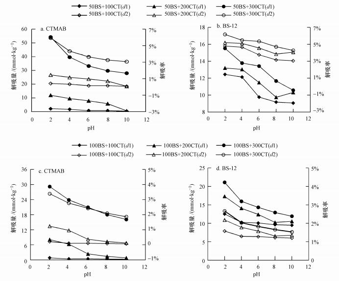 相同BS-12修饰比例下, pH对CT解吸量的影响随CTMAB修饰比例的增大而增加.pH由2增加至10时, 50BS+300CT、50BS+200CT和50BS+100CT复配修饰土样中CT的解吸量分别减少了26.32、11.33和1.76 mmol·kg-1(图 2a, 2b), 100BS+CT土样中CT解吸量的减小量表现为: 100BS+300CT>100BS+200CT>100BS+100CT(图 2c, 2d).