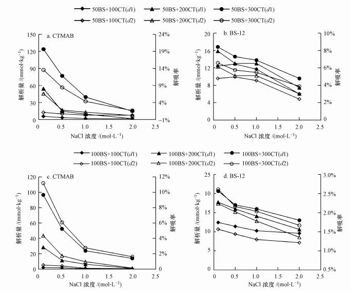 | 图 3 NaCl浓度对供试土样稳定性的影响(a, b. CTMAB与50%BS系列复配修饰的解吸结果, c, d. CTMAB与100%BS系列复配修饰的解吸结果) Fig. 3 Effect of NaCl concentration on stability of modified bentonites |