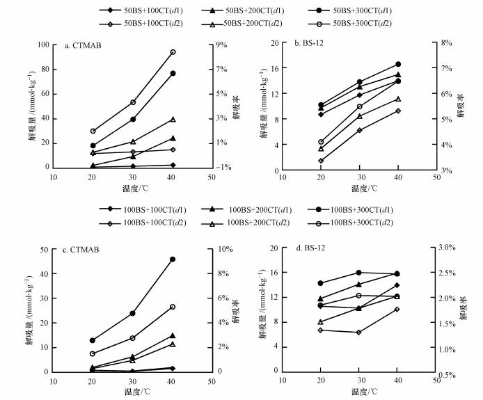 | 图 4 温度对供试土样稳定性的影响(a, b. CTMAB与50%BS系列复配修饰的解吸结果, c, d. CTMAB与100%BS系列复配修饰的解吸结果) Fig. 4 Effect of temperature on stability of modified bentonites |