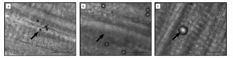 | 图 1 附着在鳃上的微塑料颗粒(a. 20 μm, b. 40 μm, c. 90 μm) Fig. 1 Location of microplastic particles in rainbow trout gills (a. 20 μm, b. 40 μm, c. 90 μm) |