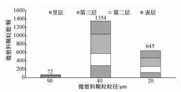 观察并计算从内到外每片鱼鳃上的分布如图 2所示, 对于90、40和20 μm微塑料颗粒, 从表层鳃片到最内部的分布为20:21:13:18, 145:146:228:158和125:145:201:174.可以看到微塑料颗粒已经进入最里面的鳃片上, 且各鳃片上的分布较为均匀, 并没有显著性差异.通过计算两条鱼上微塑料的附着总颗粒数, 发现不同粒径的微塑料颗粒在虹鳟鱼的附着情况不同, 其中90 μm粒径的微塑料颗粒附着程度较少, 但经过2 h的暴露还是有72颗微塑料颗粒附着在虹鳟的鳃上;40 μm粒径的微塑料附着程度最高, 共发现1354颗;而对于20 μm粒径的微塑料颗粒, 共有645颗附着在虹鳟的鱼鳃上.