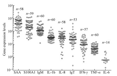 | 图 3 不同基因的表达程度(横线是每种基因的平均表达程度, n代表能够测出基因表达的样品量) Fig. 3 Relative immune gene expression (Horicontal bars indicate geometric means, n presents the number of sample expressed the gene) |