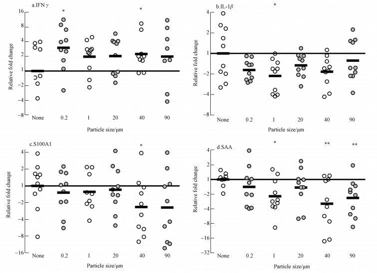 | 图 4 IFNγ、IL-1β、S100A1和SAA在不同粒径下的基因表达(*表示差异性显著, 显著性水平为5%, **表示差异性显著性水平为1%) Fig. 4 Expression of IFNγ, IL-1β, S100A1 and SAA under different diameters |