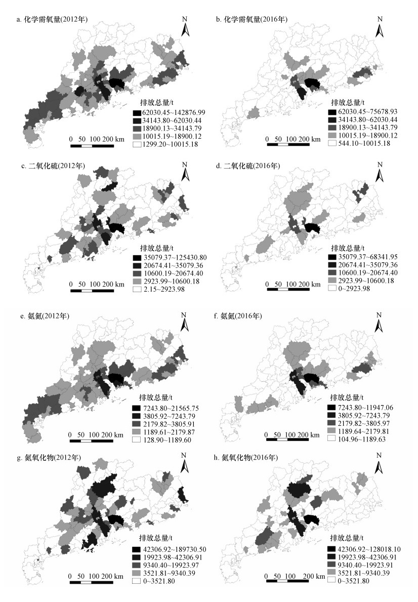 | 图 2 广东省县域水气环境污染物排放空间格局 Fig. 2 Spatial pattern of emission of water and air pollutants in Guangdong Province |