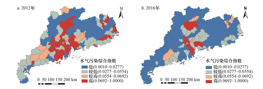 以2012年均值为中间值, 以中间值的±25%为区间, 将县域水气污染综合指数分为低、较低、较高、高4个等级(图 3), 梳理水气环境污染的时空变化特征.结果表明: 2012年水气污染综合指数等级为高和较高的县域数量分别为26、12个, 污染指数等级为较低和低的区域数量分别为38、45个.对污染排放情况进行统计, 污染指数等级为高和较高的县域数量仅占广东省全部县域数量的31.40%, 但其水气污染综合指数却占到广东省的64.25%, 即这1/3的县域承载了整个广东省近2/3的水气污染排放压力.从空间格局来看, 污染指数高等级的县域集中分布在珠三角9市及其周边城市, 粤东的部分县域也属于高污染区.污染指数等级较高的区域则大多紧邻高污染区分布.两类污染排放高值区域在空间上总体呈现出“核心-边缘”结构.污染指数等级为较低的县域主要分布在粤西和粤东沿海, 污染指数低的县域则主要在粤北山区, 污染排放低值区域在空间上呈现出由沿海向内陆递减的格局.这种污染排放的空间格局表明在高速工业化、城市化的背景下, 珠三角高排放、高污染的发展模式已经开始向周边城市蔓延, 并逐渐影响到相对欠发达的粤东、粤西地区.并且由于交通区位方面的优势, 沿海的县域相对更易受到影响.至2016年, 水气污染综合指数等级为高和较高的县域数量分别降至6个和4个, 降幅分别达到76.92%和66.66%.污染指数等级为较低的县域数量也从38个降至29个, 低污染指数的县域则由45个增加至82个, 县域层面水气环境污染减排效果突出.污染排放情况的统计显示, 污染指数等级为高和较高的县域数量占广东省全部县域数量的8.26%, 其所承载的水气污染排放占到全省的39.61%.对比2012年的数据可以发现, 尽管污染指数高于平均值的县域大幅减少, 但这些仍处于污染高排放状态的县域承担着近5倍于其它县域的污染排放压力.与之相应地, 水气环境污染的空间格局也呈现出收缩、极化的趋势, 粤东西北地区原本处于较低污染等级的县域均转化为低污染等级, 珠三角周边原本处于高污染和较高污染等级的大部分县域也进入了较低甚至低污染等级.整体来看, 广东省水气环境污染改善明显, 反映出主体功能区规划、大气和水污染防治行动计划、珠江三角洲清洁空气行动计划等国家、省域层面各类环境规制政策的积极效果.