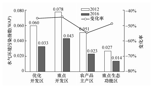 | 图 4 2012—2016年广东省各类主体功能区水气污染综合指数 Fig. 4 The WAPI of major functional zones in Guangdong Province in 2012, 2016 |