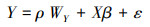 当因变量存在空间滞后效应时, 在一般线性回归模型的基础上添加因变量的空间滞后项WY, 转化为空间滞后模型(SLM), 模型表达式见式(5).