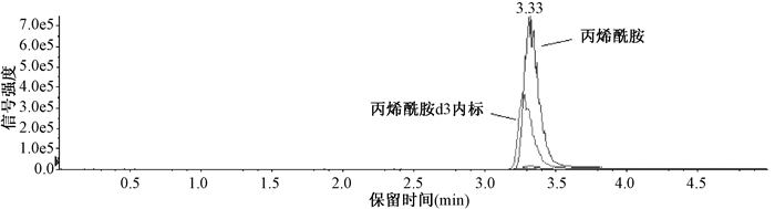 1.2 主要试剂丙烯酰胺标准品购于美国SIGMA公司(纯度99%);丙烯酰胺d3内标购于SIGMA公司(纯度大于98%)。甲醇为农药残留级高纯溶剂,纯水为Barnstead所制超纯水18.2 MΩ。