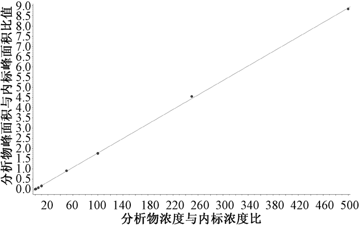 取上述标准溶液用纯水配制成0.50、5.0、10.0、50.0、100、250和500 μg/L标准系列,其中内标浓度为50.0 μg/L,进样分析。