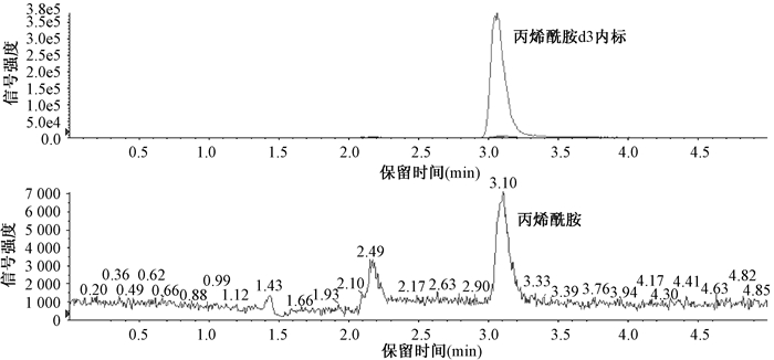由于丙烯酰胺在反相柱上不保留,且进样基体为水,故本研究选择对极性化合物保留强,且对水相稳定的Atlantis T3柱进行实验。实验比较了甲醇/水,乙腈/水流动相配比对丙烯酰胺测定的影响,发现甲醇/水分离的丙烯酰胺峰形较好。当甲醇/水比例为(5/95) 时,丙烯酰胺在柱上具有较好的保留和较高的灵敏度(图 1,纵坐标为信号强度,横坐标为运行时间)。丙烯酰胺依据本体的保留时间、内标的保留时间及本体的母子离子对定性。