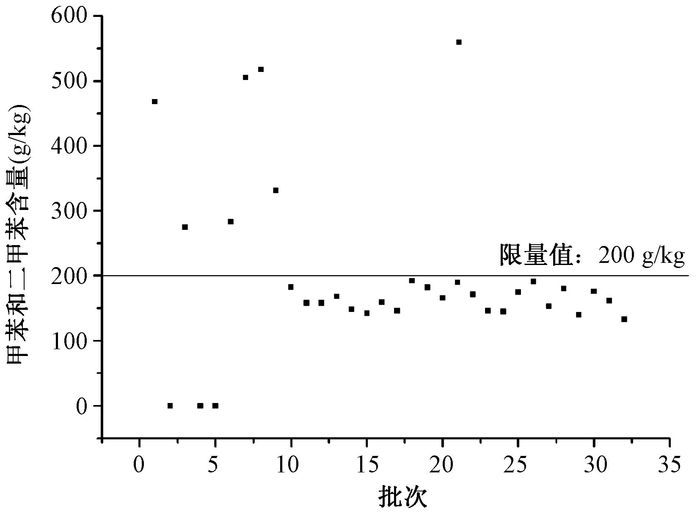 | 注:本方法检出限为0.04 g/kg 图 1 鞋用胶黏剂中甲苯和二甲苯含量情况分布 |