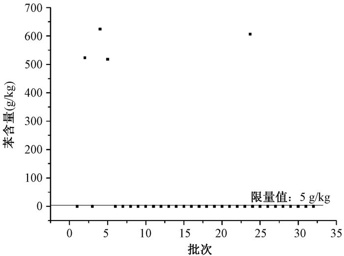 | 注:本方法检出限为0.02 g/kg 图 2 鞋用胶黏剂中苯含量情况分布 |