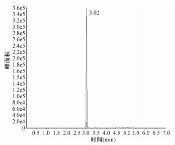 1.3 色谱质谱条件Waters ACQUITY UPLC TM BEH C18色谱柱(50 mm×2.1 mm, 1.7 μm); 流动相A为0.002 mol/L乙酸铵水溶液, 流动相B为甲醇; 梯度洗脱程序:0~4 min, 流动相B10%~90%;4~5 min, 流动相B90%;5~5.1 min, 流动相B90%~10%;5.1~7.0 min, 流动相B10%。流速:0.4 mL /min; 柱温:30℃; 样品室温度:30℃; 进样体积:5.0 μL。电离方式:电喷雾电离源(ESI+); 采集模式:多反应监测(MRM)模式; 质谱参数:碰撞气压力(CAD):6 psi, 气帘气压力(CUR):15 psi, 雾化气压力(GS1):50 psi, 辅助气压力(GS2):50 psi; 入口电压(EP):10 eV; 碰撞室出口电压(CXP):12 eV; 喷雾电压:5 500 eV; 气化温度:500℃。