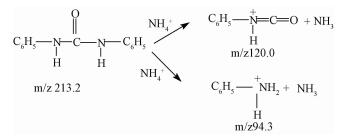 图 2的碎裂途径表明, 母离子m/z 213.2为1, 3-二苯基脲的[M+H]+峰, 他在CH3COO-NH4+作用下碎裂产生离子[C6H5-N=C=O]H+ (m/z 120.0) 和离子[C6H5-NH2]H+(m/z 94.3)
