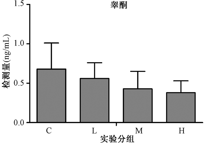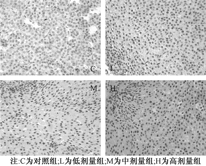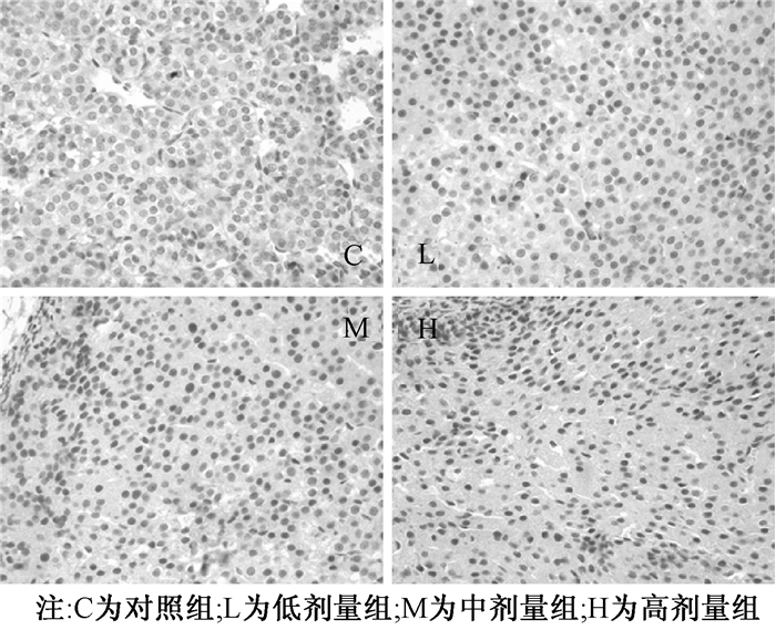 仔鼠出生后60 d血清放免结果示:血清睾酮水平与NP暴露剂量呈负相关(r=-0.417,P < 0.05),中、高剂量组睾酮低于对照组,差异有统计学意义(P < 0.01)。血清雌二醇水平与NP暴露剂量呈正相关(r=-0.462,P < 0.01),高剂量组血清雌二醇水平高于对照组,差异有统计学意义(P < 0.05;图 5、6)。