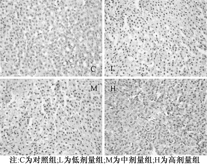 | 图 3 NP各剂量组仔鼠肾上腺IL-1β表达(21 d,400×) |
