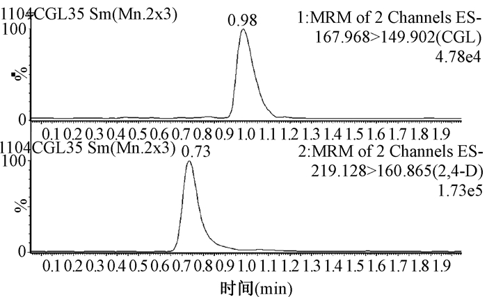 1.4 色谱质谱条件 1.4.1 质谱条件电喷雾三重四极杆串联质谱,负离子ESI模式,去溶剂温度450℃;去溶剂气流量:800 L/h;毛细管电压:2.5 kV;锥孔电压:25 V;碰撞气(氩气)流量:0.16 mL/min。MRM参数如下:草甘膦检测的定量离子对:168.0/149.9,碰撞电压:10V,定性离子对168.0/123.9,碰撞电压:12V,这两对离子对的锥孔电压都为:25 V,驻留时间都为(Dwell)0.1s;2,4-滴检测的定量离子对:219.1/160.9,碰撞电压:14 V,定性离子对219.1/124.9,碰撞电压:16V,这两对离子对的锥孔电压都为:18 V,驻留时间都为(Dwell)0.1 s。
