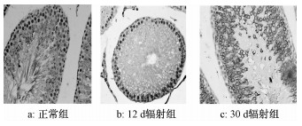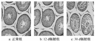 2 结果 2.1 3组大鼠睾丸组织形态比较光镜下正常组大鼠睾丸生精小管各级生精细胞排列整齐,层次清晰,管腔内充满成熟精子,12 d辐射组与正常组比较无明显变化。30 d辐射组生精小管内各级生精细胞层数减少,结构松散紊乱,有空洞形成(图 1)。