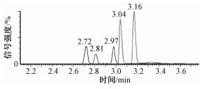 2.1.2 流动相的选择文献[10-10]分离新烟碱类杀虫剂的流动相用甲酸或乙酸铵酸化,这样可提高药物在ESI+模式下的离子化效率,促使+生成。在此基础上本实验考察了甲醇-0.3%甲酸水溶液、乙腈-0.3%甲酸水溶液、甲醇-10 mmol/L乙酸铵水溶液和乙腈-10 mmol/L乙酸铵水溶液四种流动相组合后发现,使用乙腈-0.3%甲酸水溶液作为流动相时峰形最好,灵敏度最高。图 1为5种新烟碱类杀虫剂混合标准溶液(20 μg/L)的总离子流色谱图(TIC),各物质名称及保留时间与表 1对应。