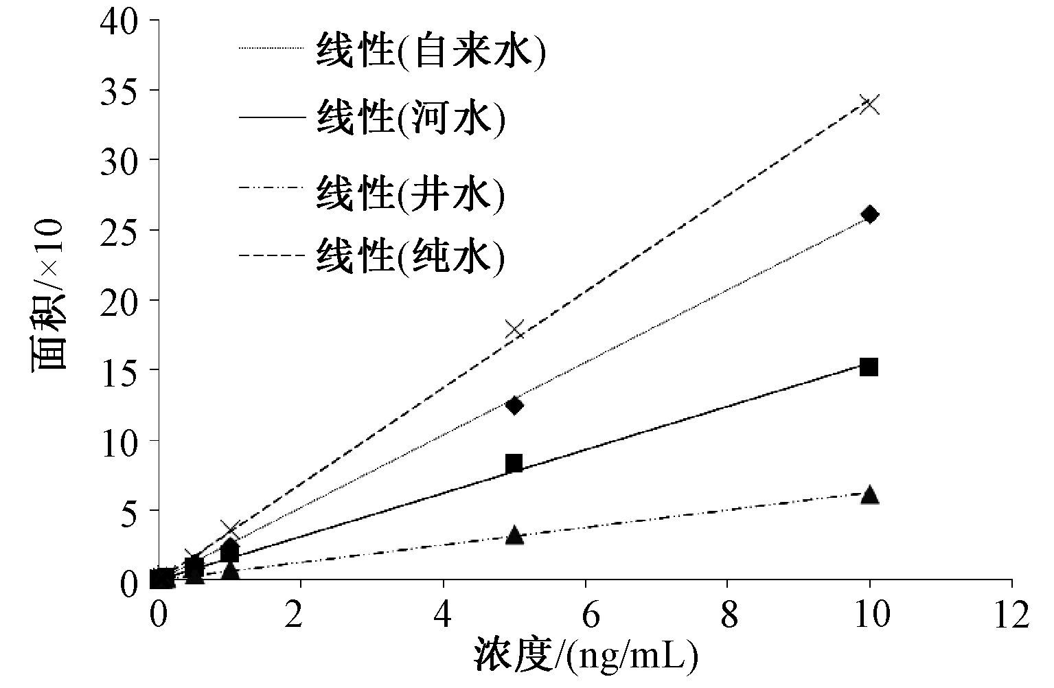 2.3 基体效应样品基体会对待测物质的信号产生不同程度的抑制或增强作用,尤其在进样量较大时基体效应更为明显。为了考察不同水体基体样品对TDI分析效果的影响,实验采用纯水、自来水、地表水和井水4种水体配制标准曲线。于4种类型水中加入适量标准使用液,配制成0~10 ng/mL的标准工作曲线,每个类型标准工作曲线测定3次,计算测定平均值,绘制标准工作曲线。通过分析结果发现,不同水体对TDI的测定具有较大影响,4种基体的标准工作曲线见图 2。4种水基体的基体效应分别为纯水<自来水<河水<井水,与纯水基体标准曲线7个质量浓度点相比,自来水、河水和井水各点的平均相对偏差分别为25%、40%和74%。为保证样品测定结果的准确性,测定不同基体的样品时,应采用没有待测物质的基体配制标准工作曲线或采用同位素稀释法进行测定样品测定。