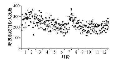 | 图 2 2015年无锡市某三甲综合医院逐日呼吸系统门诊量散点图 |