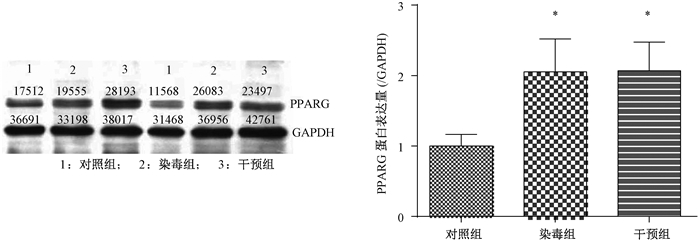 | 注:*和对照组比,P < 0.01 图 1 各组正常孕鼠胎盘PPARG蛋白表达 |