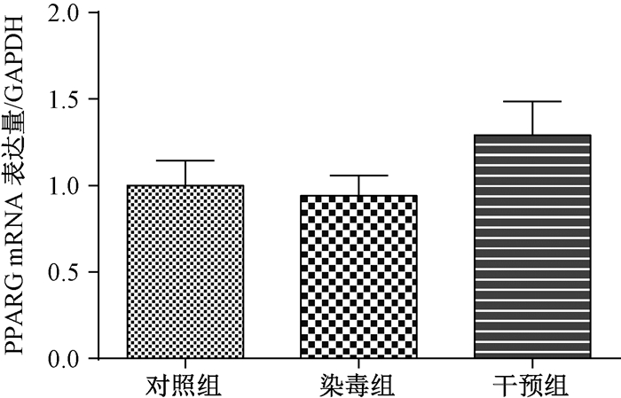 染毒组和干预组PPARG蛋白表达均显著高于对照组(P < 0.01;图 1);mRNA表达无明显改变(P>0.05;图 2)。