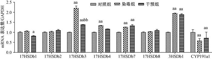 | 注:a:与对照比P<0.05;aa:与对照比P < 0.01;bb:与染毒组比P < 0.01 图 3 各组正常孕鼠胎盘激素合成相关酶mRNA表达 |