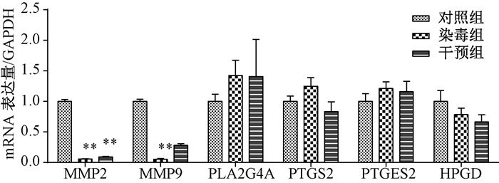 染毒组基质金属蛋白酶MMP2和MMP9表达显著高于对照组(P < 0.01;图 4),其中MMP9表达在干预组显著回复(与对照组比P > 0.05),前列腺组合成代谢酶PLA2G4A、PTGS2、PTGES2、HPGD各组间无明显改变(P > 0.05)。