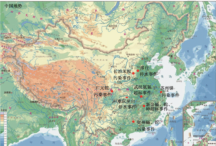 当前我国经济快速发展、工业化进程显著加快, 但是水环境突发污染事件仍处于高发期。近5年来,我国接连发生了8次重要的饮用水污染停水事件[1](图 1),其中包括2013年7月,广西贺州镉、铊超标停水事件等;2014年4月,湖北武汉氨氮超标停水事件等; 2014年7月,江苏苏州锑超标停水事件等;2014年8月, 重庆巫山县停水事件等;2015年3月,河北邢台停水事件等;2016年4月, 江西新余镉、铊、砷超标停水事件等[2];2017年5月, 四川广元铊超标停水事件[3]。这些突发污染事件发生地点分布广泛,影响范围从几万人到十几万人,严重影响城市供水安全,给公众和社会秩序带来了很大困扰。同时也暴露出我国现有的饮用水中污染物评价体系不完善的问题,我国现行的《生活饮用水卫生标准》(GB 5749-2006)[4]中的污染物标准限值是依据终生暴露风险评价而得出的, 即以成人作为保护目标,暴露发生在整个生命周期;而按照国际上普遍采用的方式,短期暴露风险评价通常是基于对敏感人群的保护(将儿童作为敏感人群的代表);两者对健康影响的浓度不同。因此,《生活饮用水卫生标准》(GB 5749-2006)[4]并不适用于与突发污染事件相适应的短期暴露风险评价。为解决上述问题,本研究通过对饮用水中污染物短期暴露风险的国内外海量文献检索和研究,提出了采用短期暴露健康风险参考值(Health Risk Advisory Value, HA)的推导方法对饮用水中污染物进行短期暴露健康风险的评估方法,目的是为完善我国饮用水中污染物健康风险评价体系和饮用水污染事件应急处置工作提供技术支持。