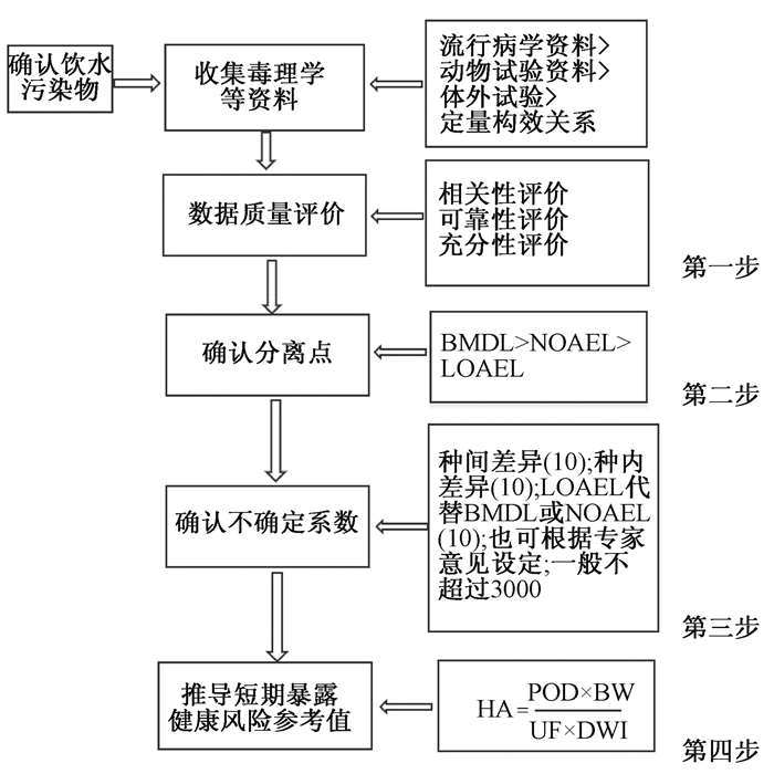 饮用水短期暴露健康风险参考值(HA)是指人类在短期暴露时间内通过饮用水暴露途径摄入某种(或某些)物质,而不产生可检测到非致癌性健康风险的安全限值,单位为mg/L。饮用水短期暴露健康风险参考值制定的主要步骤(图 2)包括毒理学等数据的收集和筛选、分离点的确定、不确定系数的选择和健康风险参考值推导。