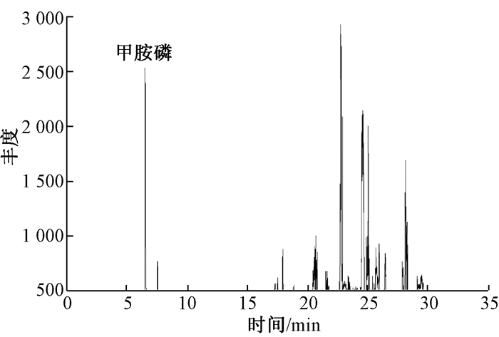 2010年6月,淮安市清浦区一居民家中老、中、少3人午饭后突发食物中毒,出现不同程度的头晕、头痛、恶心呕吐、腹痛腹泻并伴瞳孔缩小,临床检测血清胆碱酯酶活性降低。怀疑有机磷中毒,疾控部门对米饭、烧大白菜、生活用水、炒韭菜等食物一一进行排查,最后在炒韭菜中检测出甲胺磷(图 2)。公安部门已排除人为投毒,韭菜中的甲胺磷系农药残留。