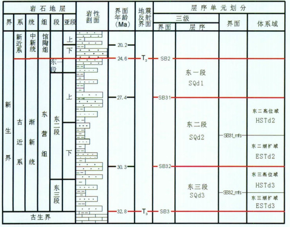 (1) 东营组可划分为3个三级层序,自下而上分别是东三段(SQd3),东二段(SQd2)和东一段(SQdl);以最大湖泛面为界,东三段和东二段可进一步划分湖扩域和高位域。