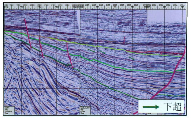 3.2 体系域界面辽西凹陷东营组的体系域界面仅识别出2个:SB32_mfs、SB31_mfs。地震响应上表现为以一明显的下超面[12, 13],界面之上常见下超现象(图 5)。在测井上,表现为界面之下水体逐渐变深的退积型准层序组,而界面之上为反映水体逐渐变浅的进积型准层序组(图 4)。岩性资料显示,界面附近常发育一套厚层泥岩。