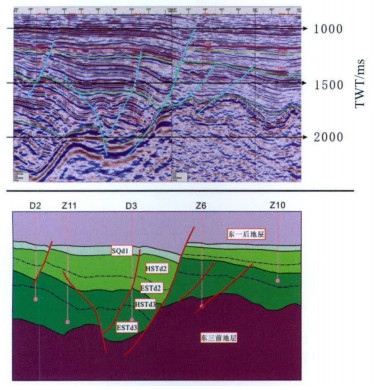 层序的划分以地震剖面上可识别的不整合及与之相对应的整合面为界,层序界面一般伴有地层超覆、地层剥蚀、岩性尖灭以及水道和下切谷等地质现象。因此,在井震结合标定层序界面时应遵循以下原则:①选择典型剖面,即垂直于地层走向或垂直于主构造方向的剖面;②资料相对完整,有利于钻井层位的标定和对比;③目标层位沉积厚度大;④断层活动相对较弱,如果不可避免,断面和断距清晰;⑤纵横交错,有利于控制全区,满足研究需要。