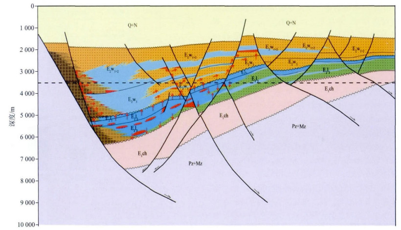 二是断裂带和深凹带垂向运移为主、侧向运移为辅的油气成藏模式。深凹带流沙港组成熟烃源岩生成的油气经侧向和沿着边界大断层垂向运移聚集成藏,涠洲组成熟烃源岩生成的油气侧向运移聚集成藏。盖层和侧向封挡层为流二段—流三段上部泥岩段、涠二段泥岩发育段,以及流沙港组近岸水下扇扇根、涠洲组水下扇扇根致密砾岩层,主要成藏层位为流沙港组、涠洲组。主要圈闭类型为扇根遮挡型、砂岩透镜体、砂岩上倾尖灭、地层超覆、断层—岩性、断块—断鼻型圈闭。