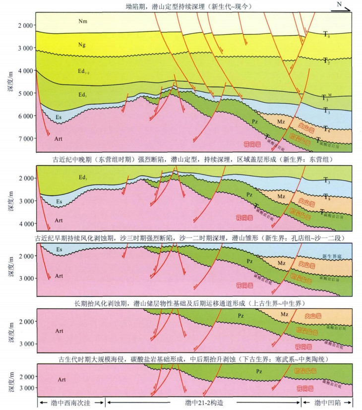 新生代时期,渤中21-22区先后经历了古近纪早期的持续风化剥蚀——强烈断陷潜山雏型期、中期的整体强烈断陷深埋定型期、晚期的坳陷发育持续深埋期。古近纪早期(孔店组~沙河街组三段沉积时期),尽管渤中凹陷进入了新生代广泛的断陷发育期,但渤中21-22区块延续了中生代末期的古隆起构造格局,长期遭受风化剥蚀,使得该区普遍缺失孔店组~沙河街组三段。而该时期渤中西南次洼和渤中凹陷强烈断陷,形成了渤中凹陷主力烃源岩——沙三段烃源岩。同时,渤中21-22区块潜山凹中隆构造格局,潜山初步定型。沙河街组沉积末期,渤中凹陷整体稳定沉降,潜山之上披覆薄层沙一、二段;古近纪中期(东营组沉积时期),渤中凹陷进入强烈断陷期,整体强烈断陷使得潜山发生深埋作用,上覆巨厚东营组区域泥岩,不仅奠定了后期油气成藏区域盖层基础,而且形成了渤中凹陷另外一套极其重要的烃源岩——东下段烃源岩。快速沉降使得潜山储层得以很好保存,从而形成了优良的储盖组合;古近纪晚期,渤中凹陷由强烈断陷向整体坳陷过渡,逐步进入了新近系的裂后坳陷阶段。该时期,潜山持续深埋(图 3)。