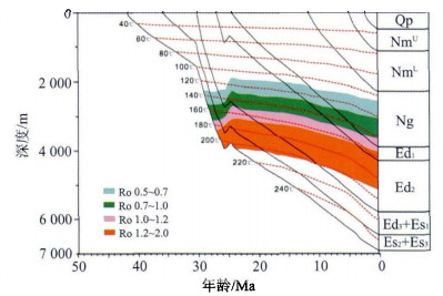通过热演化史模拟,对该地区古地温场进行了分析。以沙河街组(Es)为例,其沉积末期,渤中凹陷内古地温为30~50 ℃。由于经历了快速沉降,到东营组(Ed)沉积末期,该层在凹陷内的温度已经达到了160~190 ℃,而到明化镇组(Nm)沉积末期时,该层温度已经达到了200 ℃以上(图 4)。