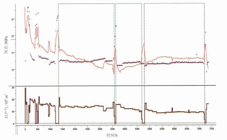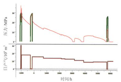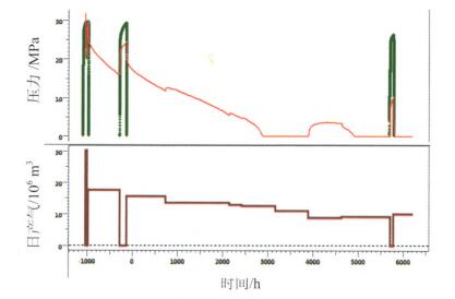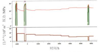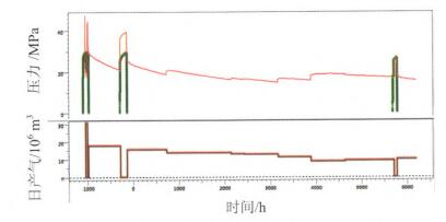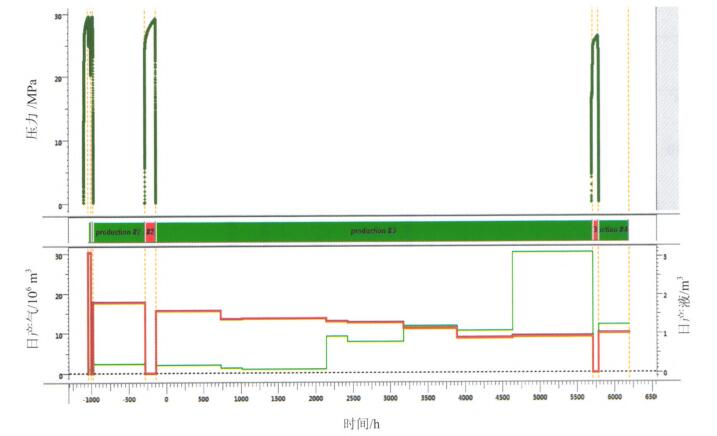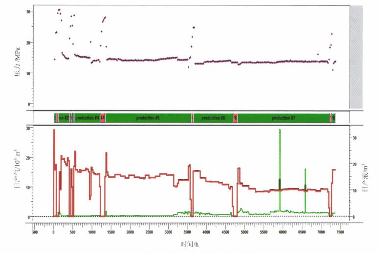 | (历史产量栏中棕色线为气产量,绿线为凝析油产量,下同) 图 1 生产井井下永久压力计历史数据 |