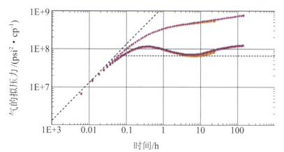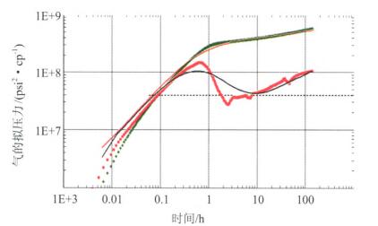 | (图中点为反褶积曲线,实线为拟合曲线;psi2/cp为拟压力单位,下同) 图 2 褶积试井解释特征曲线图 |