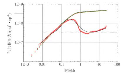 东海某探井进行了三开三关的DST测试,测试历史曲线如图 4所示。选择二关数据进行常规试井解释,其双对数曲线如图 5所示。从图 5可明显看见,末端数据较零散且有一定的跳跃,但在常规试井解释过程中往往不予考虑,而简单地采用无限大均质地层模型来解释,显然这样的解释结果存在较大的不确定性。