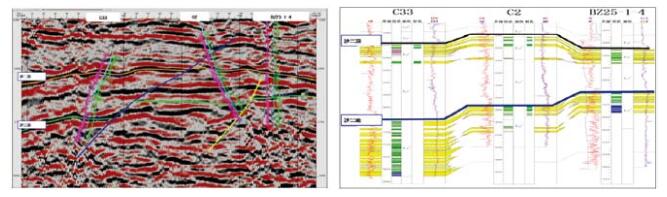 | 图 5 渤中25油田沙河街组过井地震剖面(左图)和对应的连井地质剖面(右图) |