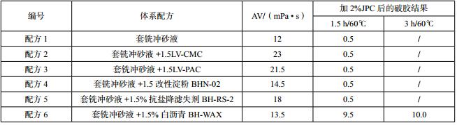 另外,新引入的降滤失剂必须在加入破胶液后可迅速降解,以满足后期返排的要求,因此对上述各配方进行破胶实验,实验结果见表 2。