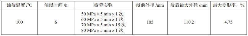 双封单卡工艺常规的压裂段数是6~8层段,15个层段压裂施工需要封隔器在井下增加1倍的工作时间。为了提高封隔器长期工作的性能,对封隔器胶筒和钢碗进行优化设计以提高耐温和耐压性能,设计保护机构增加了封隔器坐封、解封的抗疲劳强度。室内油浸实验表明(表 1),封隔器的性能满足多段压裂施工的需要。