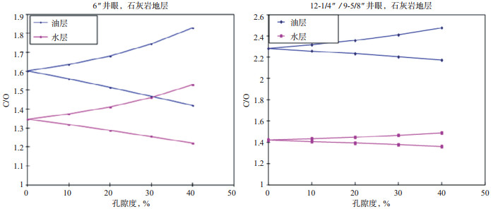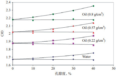 2 测井响应及影响因素 2.1 孔隙度的影响碳氧比测井解释技术主要是使用C/O和Si/Ca两条曲线来进行的。实验资料表明,只有在孔隙度比较大的地层C/O值对含油饱和度的变化是灵敏的。在中低孔隙度下,饱含油和饱含水地层的C/O值的变化量变小,C/O和Si/Ca的微小变化将引起求取的含油饱和度的很大差异;孔隙度越小,这一变化越灵敏。从图 1可以明显的看出,孔隙度和含油饱和度由小变大,测量的C/O也随之增大。由此可知,当孔隙度越小时,碳氧比测井解释技术越要考虑其它因素的影响,以求得正确的C/O和Si/Ca数值,从而可获得满意的解释结果。