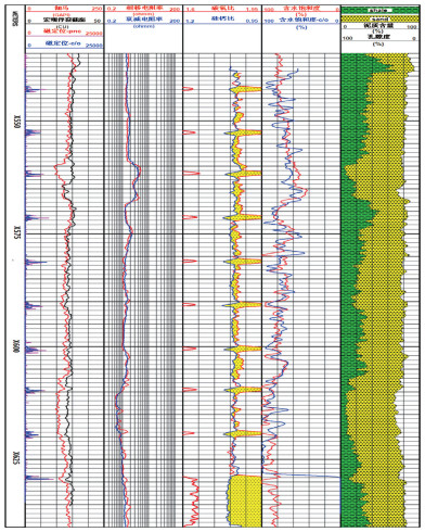 碳氧比测量结果表明,在砂岩地层中,碳氧比和钙硅比曲线重叠,两者差异小,指示为砂岩水层;碳氧比与钙硅比重叠,两者差异大,指示为油层。差异越大,砂岩含油饱和度越高。所以,钙硅比的重要用途既可以划分岩性,又可以作为解释油气层地层背景值以及确定含油饱和度地层水线。