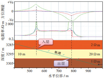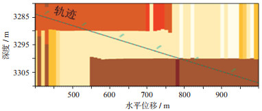 随钻过程中,PeriScope随钻测井可以利用方位测量曲线判断轨迹是入层还是出层(图 2)。同时,还可以利用PeriScope仪器的方位测量和电阻率测量等数据进行实时电阻率边界反演,进一步计算工具到地层边界的距离和地层倾角(图 3)。根据电阻率界面反演图,及时调整轨迹,提高水平井着窗的成功率和储层的钻遇率,从而有效降低构造、储层或流体性质等因素造成的不利影响。